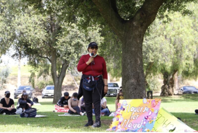 The march culminated in the grassy fields of Schabarum Park, where protesters placed their flowers on the chalked names of the black people who lost their lives to police brutality and violence. They then gathered around the shade of a large tree to take a knee of silence for the 8 minutes and 46 seconds that police officer Derek Chauvin kneeled on Floyd’s neck.