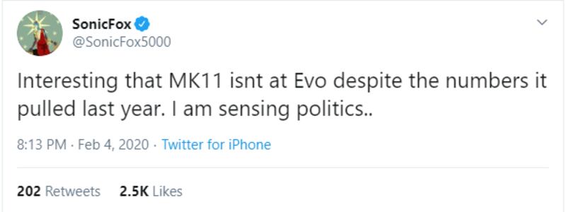 The removal of Mortal Kombat 11 this year has been somewhat controversial, with figures from the community like their concerns on twitter. Having pulled over 1,500 competitors or around ten percent of the total entrees last year, Mortal Kombat 11 wasn’t removed for a lack of competition or viewership as Soul Calibur 6 brought in 742 players in 2019 while still being on the lineup this year. While neither EVO nor the developers have made an official statement on the removal of the title, some in the community speculate that souring relations between the game’s community and EVO management may have led to its absence this year.
