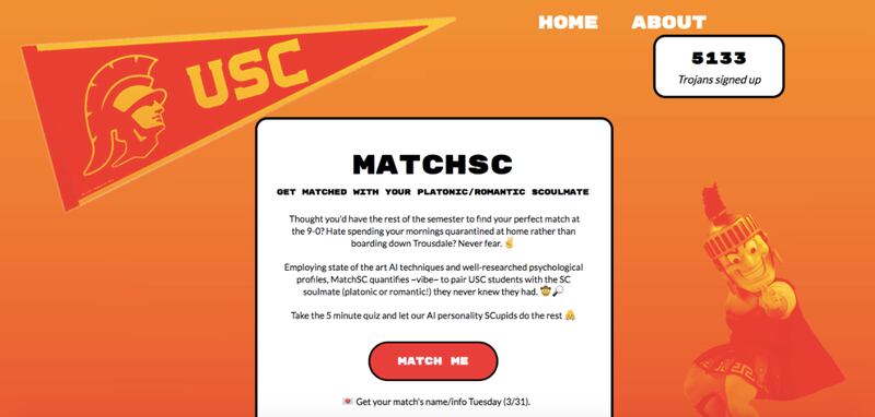 MatchSC turned out to be a matchmaking program made for USC students by USC students. The founders, who also referred to themselves as our SCupids, were brought together by their love of entrepreneurship and community-building. As described on the homepage, it was created for Trojans who thought they would “have the rest of the semester to find [their] perfect match at the 9-0.” The match would “pair USC students with [their] SC soulmate (platonic or romantic!) they never knew they had.” Factors considered by the matching algorithm were mutual friends, physical proximity, shared experience and psychological similarities. The idea only really started taking shape around February.
