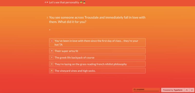 Ding! Ding! Notifications crowded my phone screen. Mere minutes after Briana had shared the MatchSC link with us, my friends and I were flooding the previously quiet group text with excited chatter about the funny quiz questions. We compared answers and laughed about each person’s explanation for their answer choices. One of the questions asked, “You see someone across Trousdale and immediately fall in love with them. What did it for you?” Answers ranged from more niche options such as, “They’re laying on the grass reading French nihilist philosophy,” to simply, “The vineyard vines and high socks.”