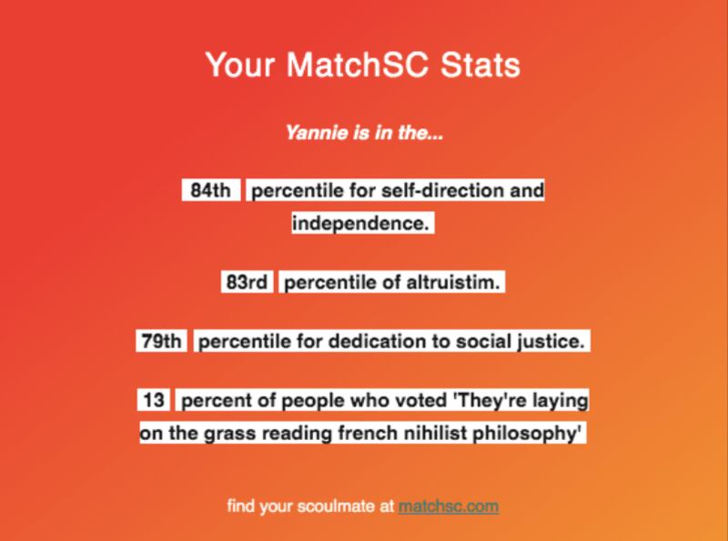So what can we expect from MatchSC in the future? Considering how the service was inspired by the Stanford Marriage Pact and Harvard’s Data Match dating programs, MatchSC will likely only happen once a semester or year, if it happens again at all. As a result, expect to bond with your match or matches, if you were lucky enough to receive two.