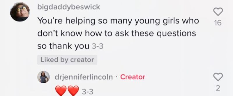 What’s more is that TikTok is not only facilitating education and disproving false information, but it is also promoting an environment for open discussion. For instance, Dr. Lincoln often posts videos reviewing the safety and efficacy of different feminine hygiene products such as Summer’s Eve. The comments section is inundated with replies such as, “I’m not a girl but I stayed to learn,” and “You’re helping so many young girls who don’t know how to ask these questions.” Queries about feminine hygiene and requests for future videos also fill the comments section.
