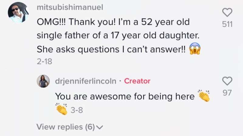 “I would love it if my TikTok became completely irrelevant and everybody stopped watching my videos,” Dr. Lincoln said, which initially surprised me until she continued to explain why. “And the reason is [if,] because in school, [young adults] were actually taught all of this stuff [about sex education]. I would love to not be needed [for that reason].”