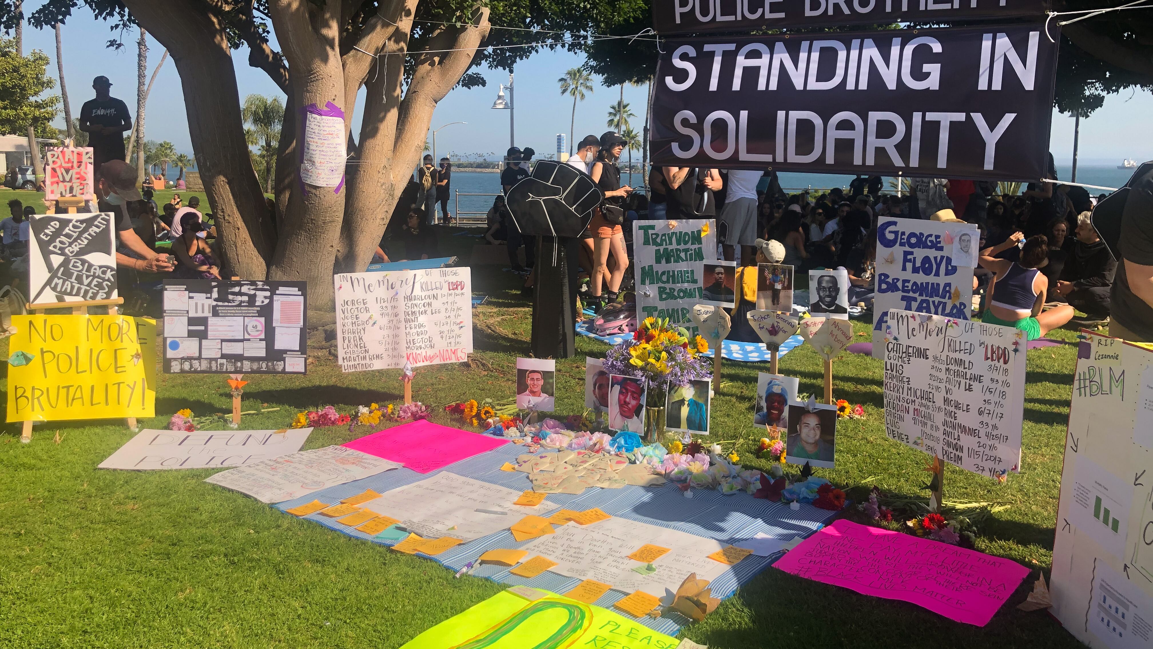 Earlier that morning, students from Cal State Long Beach had created a memorial to honor all of the lives that have been lost to police brutality. A banner hanging above the crowd read, “Standing in Solidarity.”