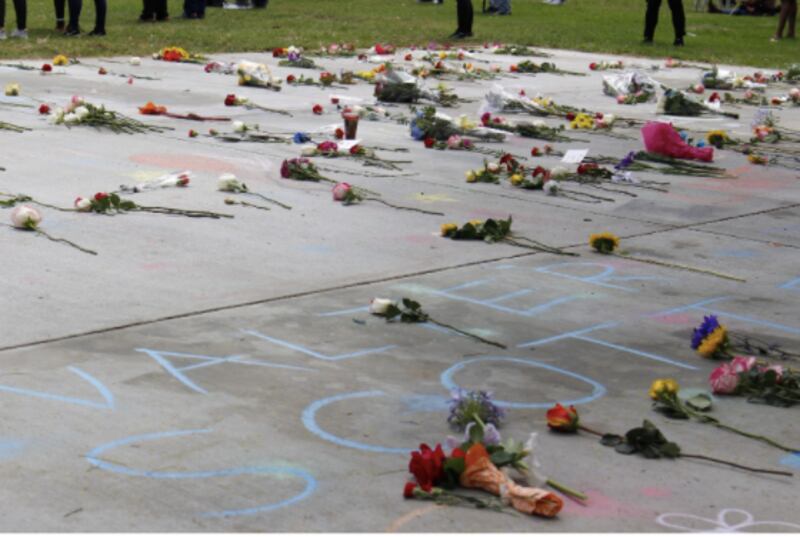 The march culminated in the grassy fields of Schabarum Park, where protesters placed their flowers on the chalked names of the black people who lost their lives to police brutality and violence. They then gathered around the shade of a large tree to take a knee of silence for the 8 minutes and 46 seconds that police officer Derek Chauvin kneeled on Floyd’s neck.
