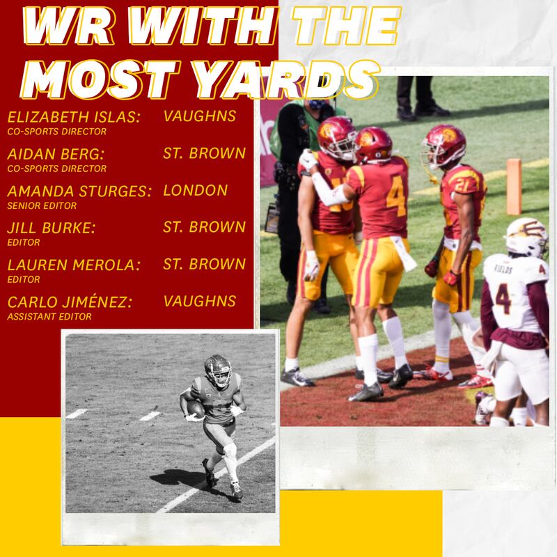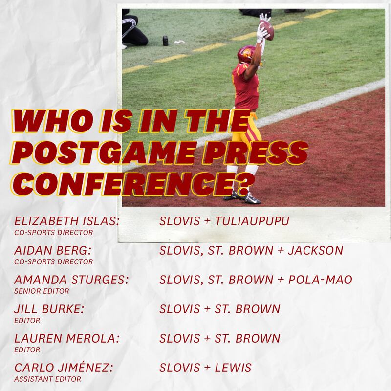 Slovis will almost surely appear in the postgame press conference. He already seems more poised in answering questions this season, and his performance is typically a deciding factor in USC’s success. Even though I picked London to have the most yards this week, I think we’ll see St. Brown in the presser with Slovis. He’s made countless game-changing catches over his career, and it’s only a matter of time before he makes another this season.