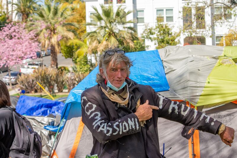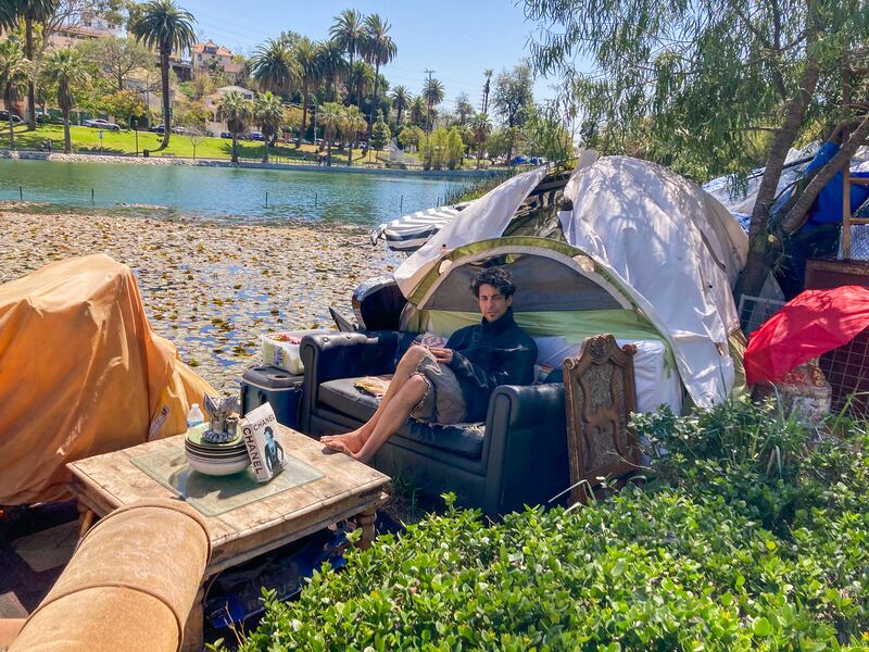 Jeff Sovine has been camping in Echo Park since last March. He said he would move to a hotel room if he were offered one, but no one has approached him with that option.