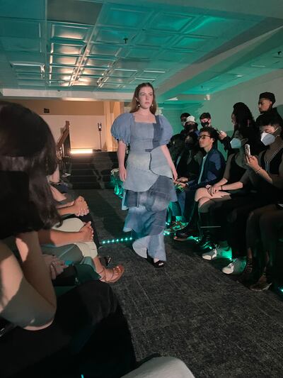 A runway lit by green LEDs glowed in the dark room, reflecting on the faces of anticipating students sitting in the front row. A model strutted languidly down the runway in a Cinderella-esque ball gown completely made of denim.