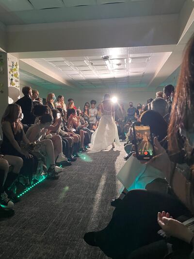 As a member of a fashion club on campus called Bloom, Bakke upcycled pieces before but never created a full outfit. Bakke was able to create two looks for the show, including an all-white dress with reflective metal plating reminiscent of armor.