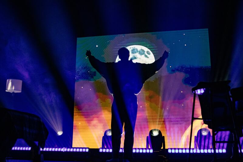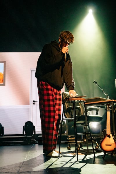 JVKE also incorporated aspects of the videos that helped propel him to fame in his live performance. The concert stage was set up to resemble his childhood bedroom, and he wore an oversized sweatshirt and plaid pajama pants that emulated the relaxed demeanor of his social media presence. Throughout the show, he utilized a beat making machine to demonstrate how he made music at home.