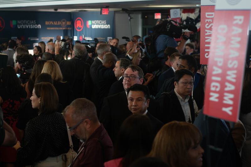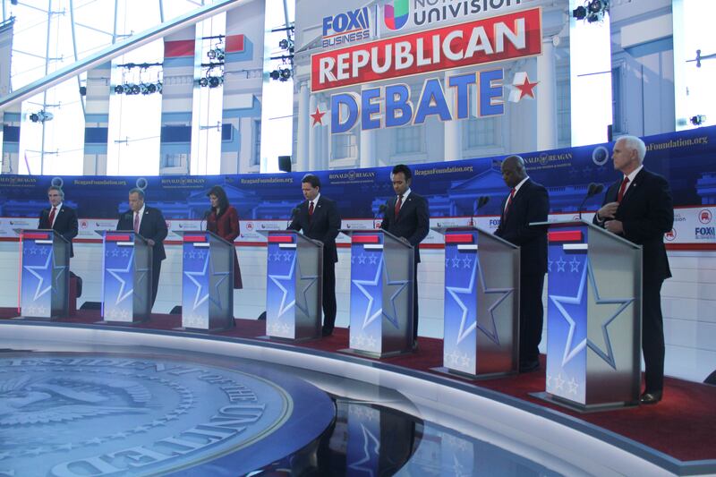 Florida Gov. Ron DeSantis, former Vice President Mike Pence, businessman Vivek Ramaswamy, former South Carolina Gov. Nikki Haley, former New Jersey Gov. Chris Christie, South Carolina Sen. Tim Scott and North Dakota Gov. Doug Burgum are in attendance. Former President Donald Trump isn’t here.