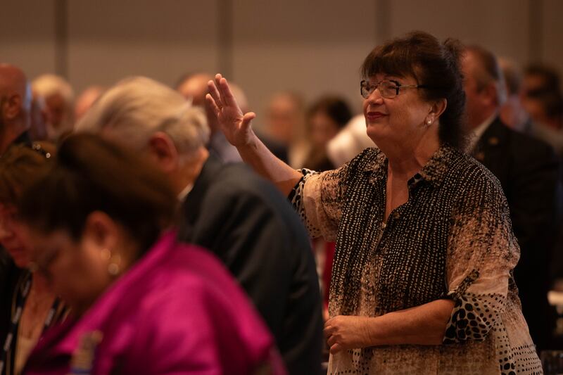 “I’m here to see Trump,” said Roberta Cox, a 77-year-old conference attendee from San Diego. Today’s lunch will be Cox’s first time in a room with the former president. Decked out in Trump garb, her excitement is palpable.