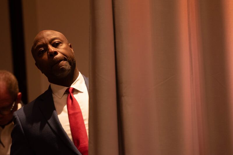 Tripods on tables are replaced with wine glasses as the Marriott’s Grand Ballroom is converted for Sen. Tim Scott’s “Fireside Chat.” Two arm chairs sit upon the stage. The Mamas & the Papas “California Dreamin” plays over the speakers.