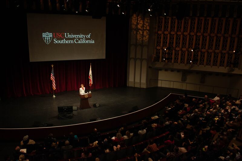 During the speech, Folt spotlighted the university’s successes in the past year. She highlighted USC’s successful admissions tactics, like the community college transfer program and a strong budget. She commended the women’s basketball team for making it to the Sweet 16, and she discussed a new building for the USC School of Dramatic Arts that will have a ribbon cutting soon. She also said the university is working to rebuild its reserve after the effects of the pandemic.