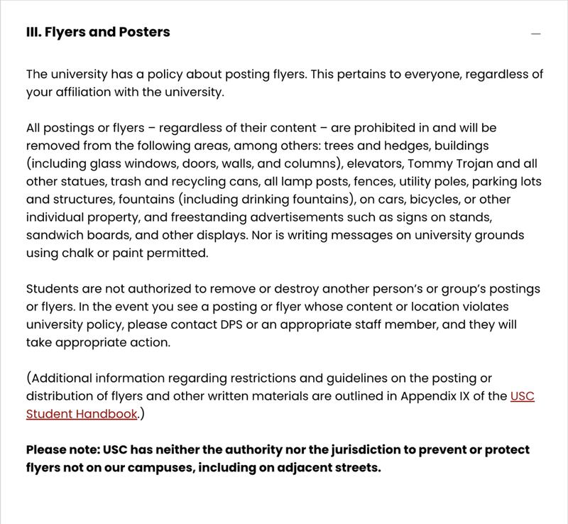 The module states: “The university has a policy about posting flyers. This pertains to everyone, regardless of your affiliation with the university. All posters or flyers – regardless of their content – are prohibited in and will be removed from the following areas, among others: trees and hedges, buildings… elevators, Tommy Trojan and all other statutes, trash and recycling cans, all lamp posts, fences, utility poles, parking lots and structures, fountains, on cars, bicycles, or other individual property, and freestanding advertisements such as signs on stands, sandwich boards, and other displays.”