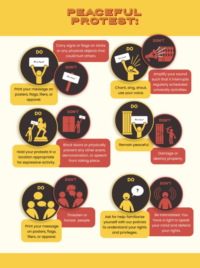 The webpage includes a helpful graphic “Peaceful Protest Dos and Don’ts.” With statements such as “chant, sing, shout, use your voice,” and “you have a right to speak your mind and defend your rights,” the graphic is encouraging. Two of the six “Dos” include “Do print your message on posters, flags, flyers, or apparel.” USC asks that protests be within “a location appropriate for expressive activity.”