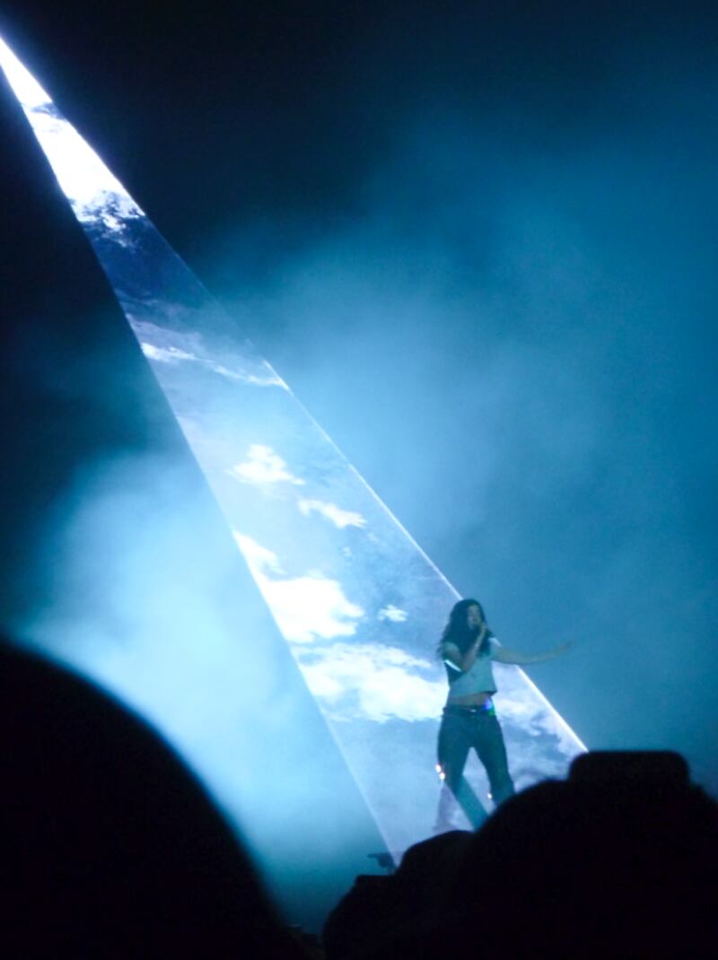 This laser beam made another appearance during her song “Perfect Places,” cutting straight through her torso. This song describes the endless partying and drinking present in adolescence as a means to find this utopia in the face of reality. The light, similar to her lyrics, cut straight through her, revealing a vulnerability to the audience.